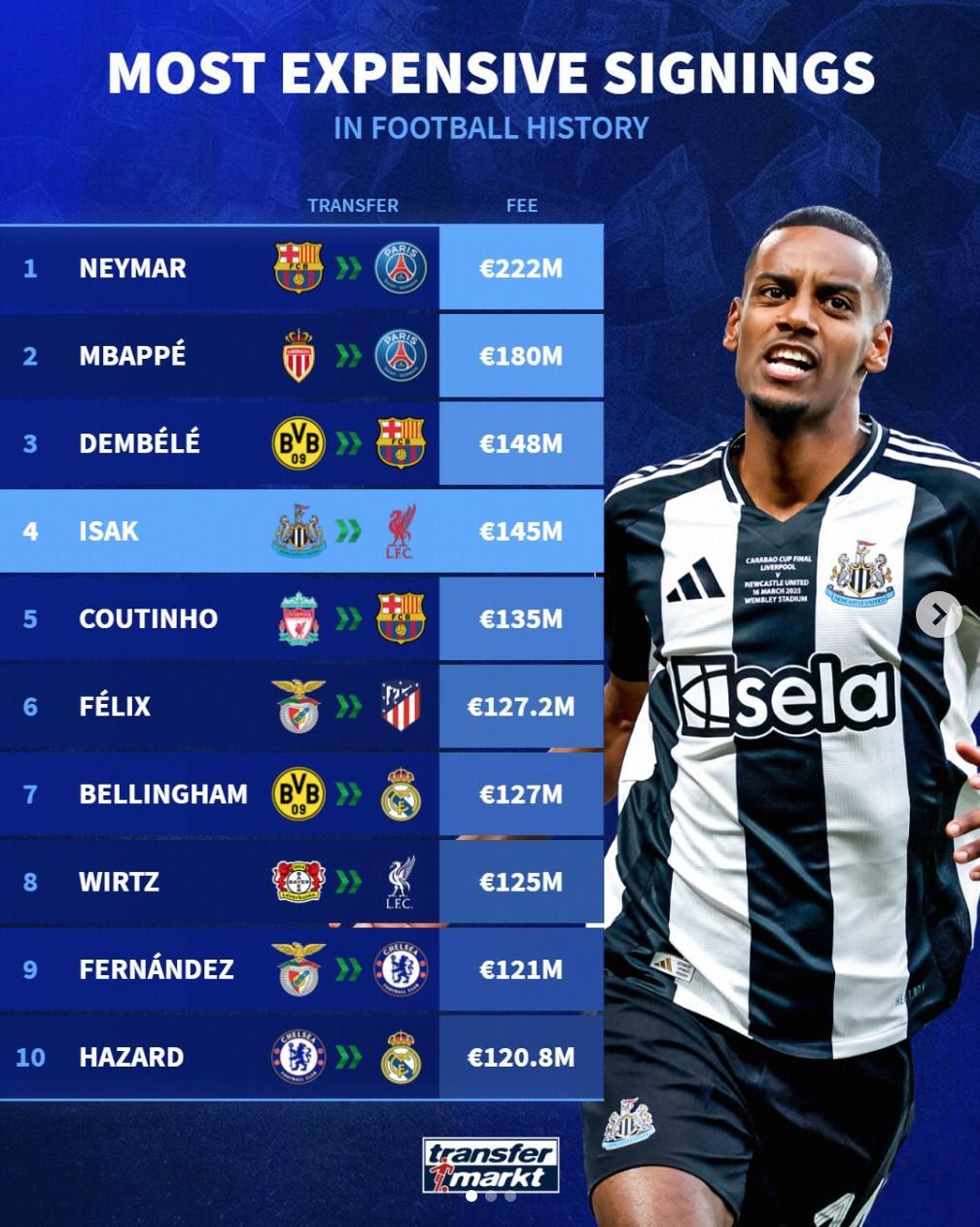 2025年夏窗结束,世界足坛历史转会费的TOP50榜更新,今夏五人上榜,伊萨克与维尔茨进入前十。内马尔的2.22亿欧依然居首,他也是唯一三度上榜的球员。1.内马尔 2.22亿欧(17/18 巴萨→巴黎)2.姆巴佩 1.8亿欧(18/19 摩纳哥→巴黎)3.登贝莱 1.48亿欧(17/18 多特→巴萨)4.伊萨克 1.45亿欧(25/26 纽卡→利物浦)5.库...